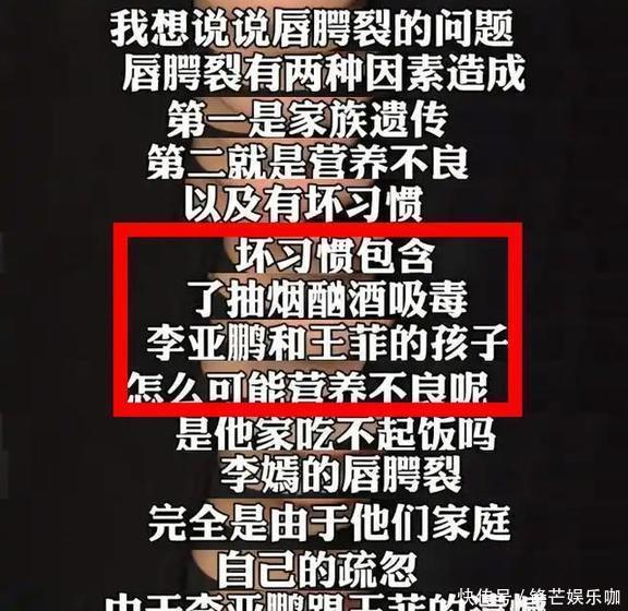 其实啊,关于王菲孕期抽烟这事儿,李亚鹏早就出来说过不是真的了。而且就算真在孕期抽烟喝酒,也不一定就直接导致李嫣唇腭裂。更关键的是,王菲和李亚鹏从来没让大伙儿为李嫣的病掏钱,他们自己反倒帮助了更多有唇腭裂的孩子。网友们捐款,也不是被李亚鹏逼着,是真心被他们做的好事儿打动了。那个“妖怪”还隔着屏幕质问李亚鹏,怎么选要帮助的唇腭裂患者。他还阴阳怪气地问:那些家里条件不错,却因为自己生活不注意导致孩子唇腭裂的家庭,你们帮还是不帮?